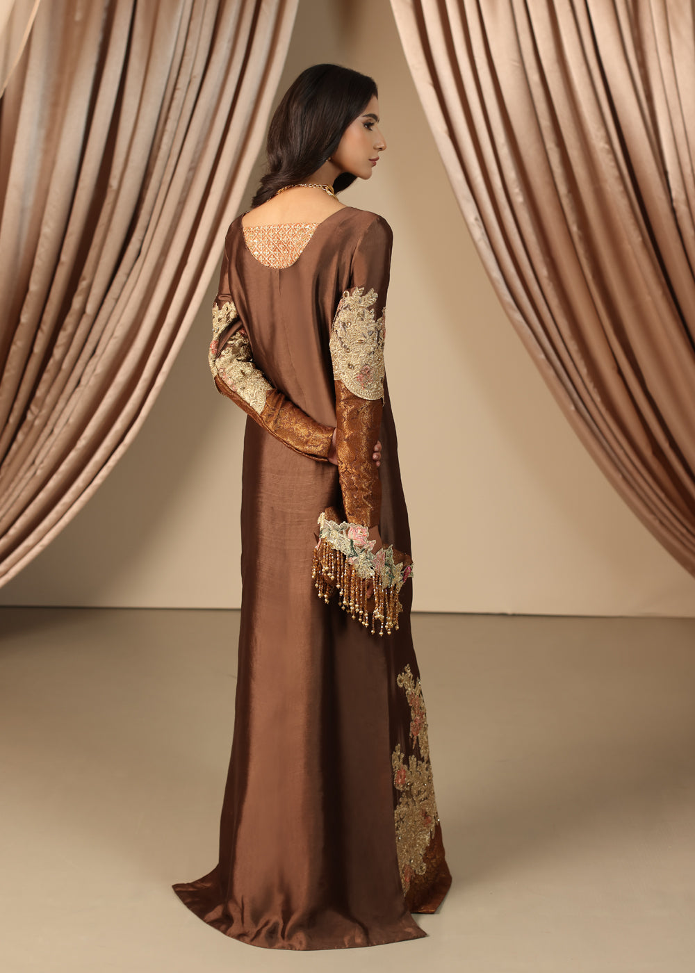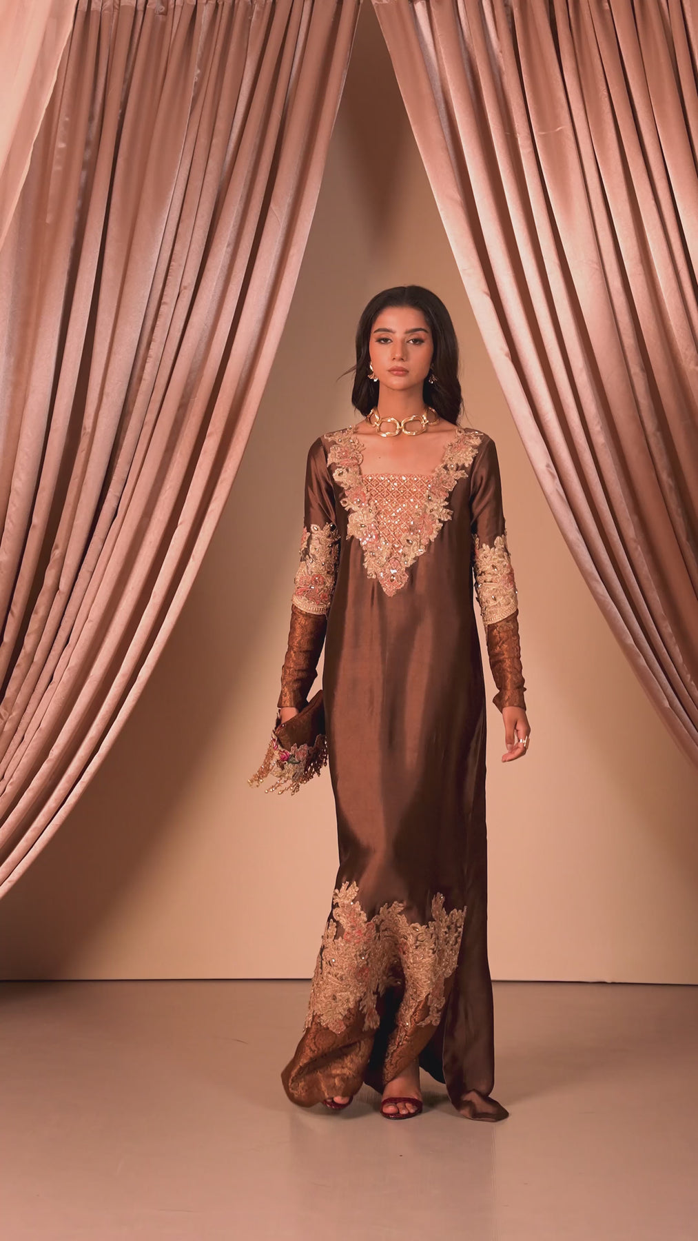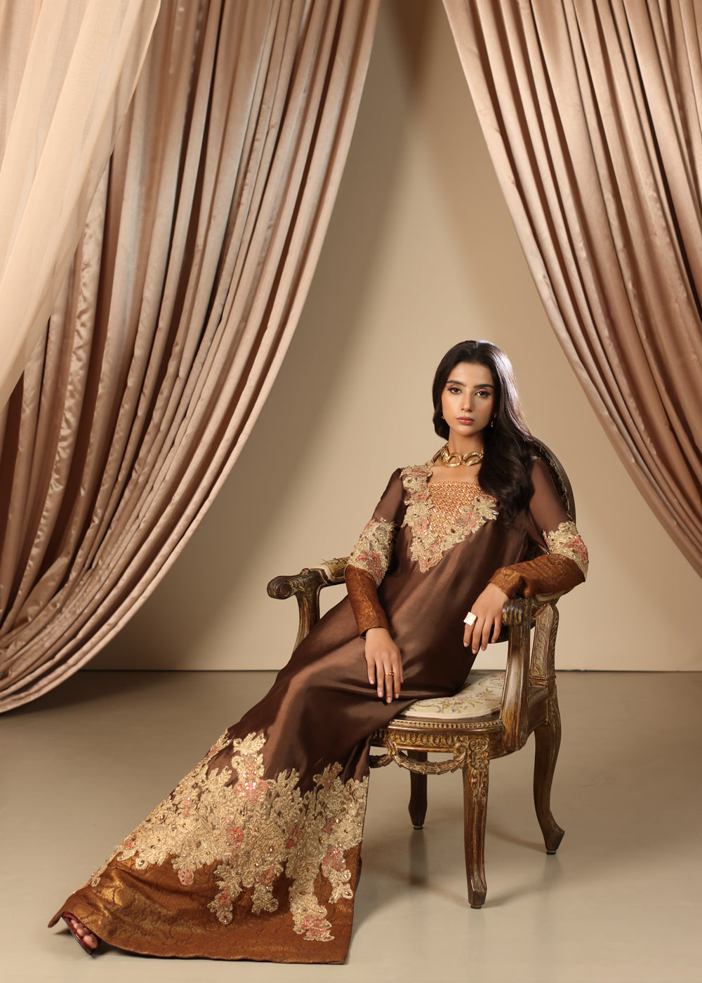 “Mocha Romance” is where rich tradition meets modern luxury. This premium silk kaftan is a poetic fusion of antique Kimkhab and fully embroidered check sequin organza, brought to life in a dreamy mocha brown hue. The piece is adorned with intricate golden tilla and soft peach resham embroidery, creating an enchanting contrast of texture and tone.