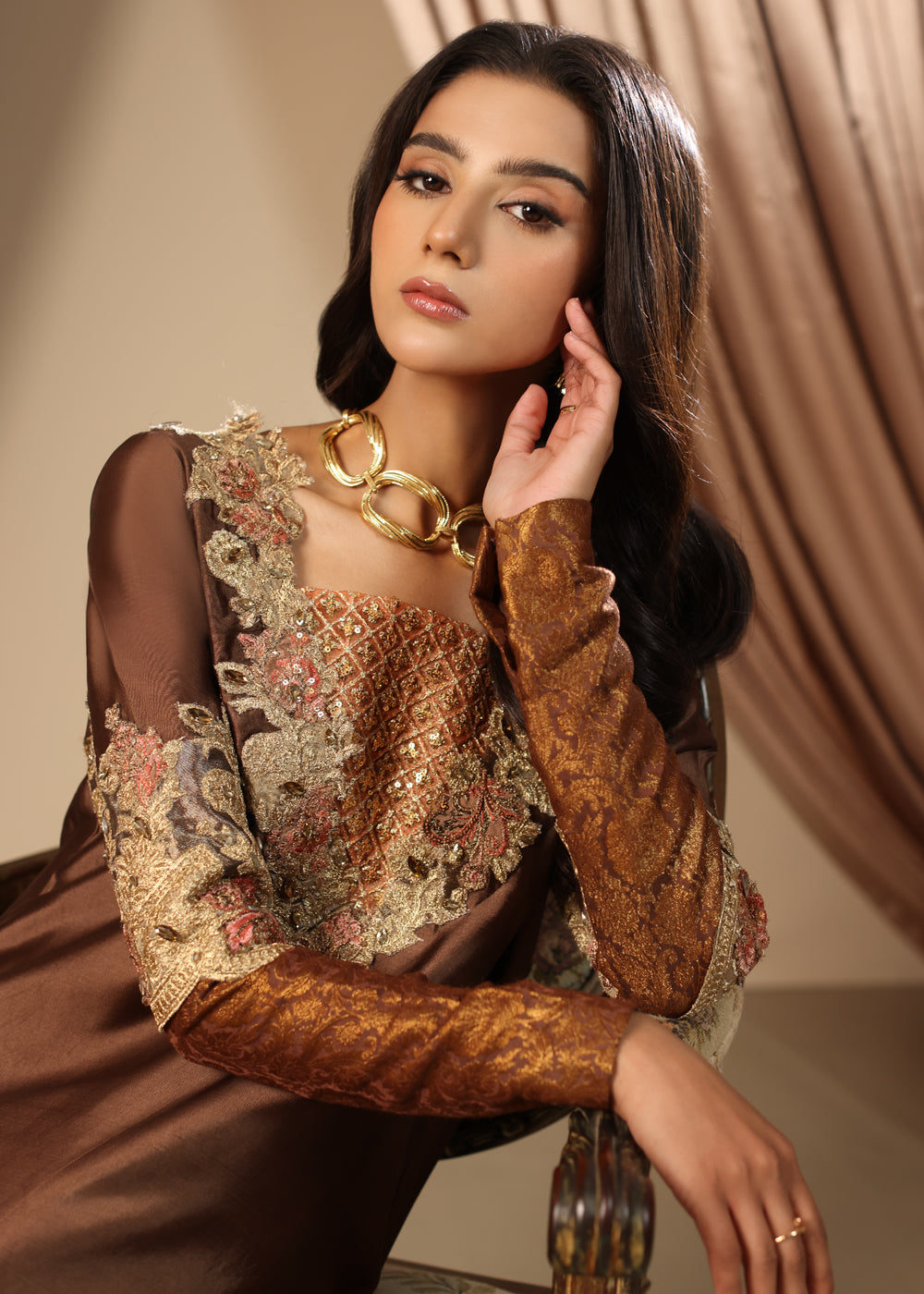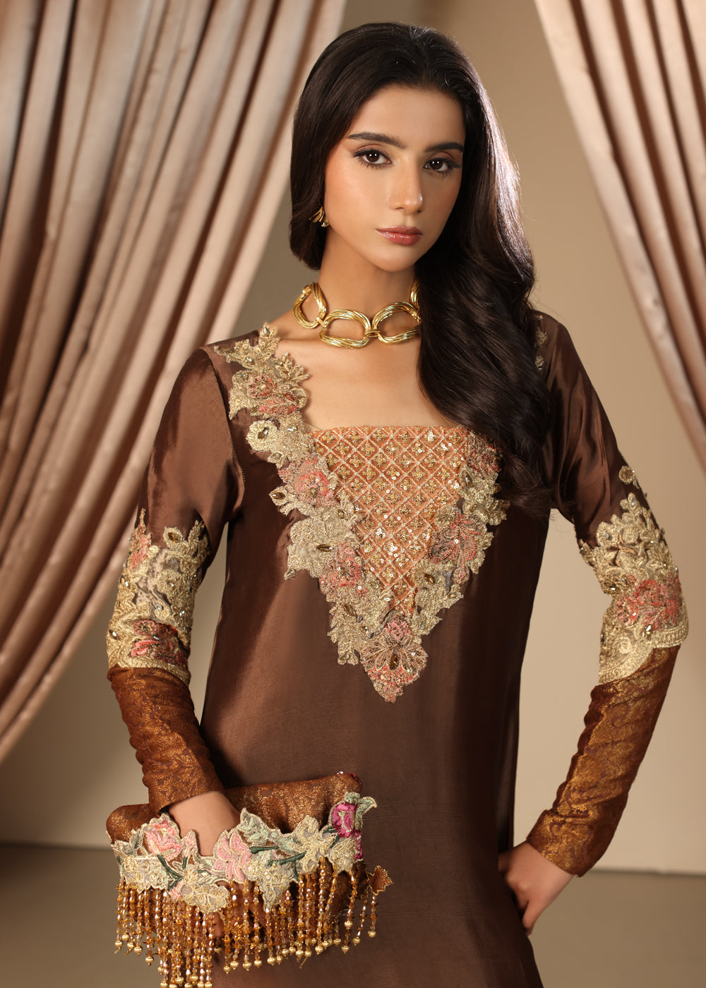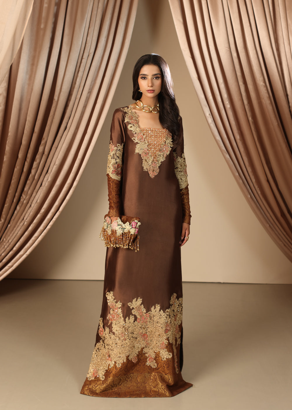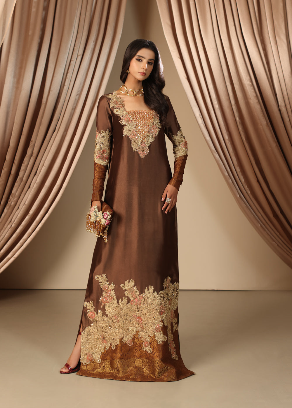 “Mocha Romance” is where rich tradition meets modern luxury. This premium silk kaftan is a poetic fusion of antique Kimkhab and fully embroidered check sequin organza, brought to life in a dreamy mocha brown hue. The piece is adorned with intricate golden tilla and soft peach resham embroidery, creating an enchanting contrast of texture and tone.