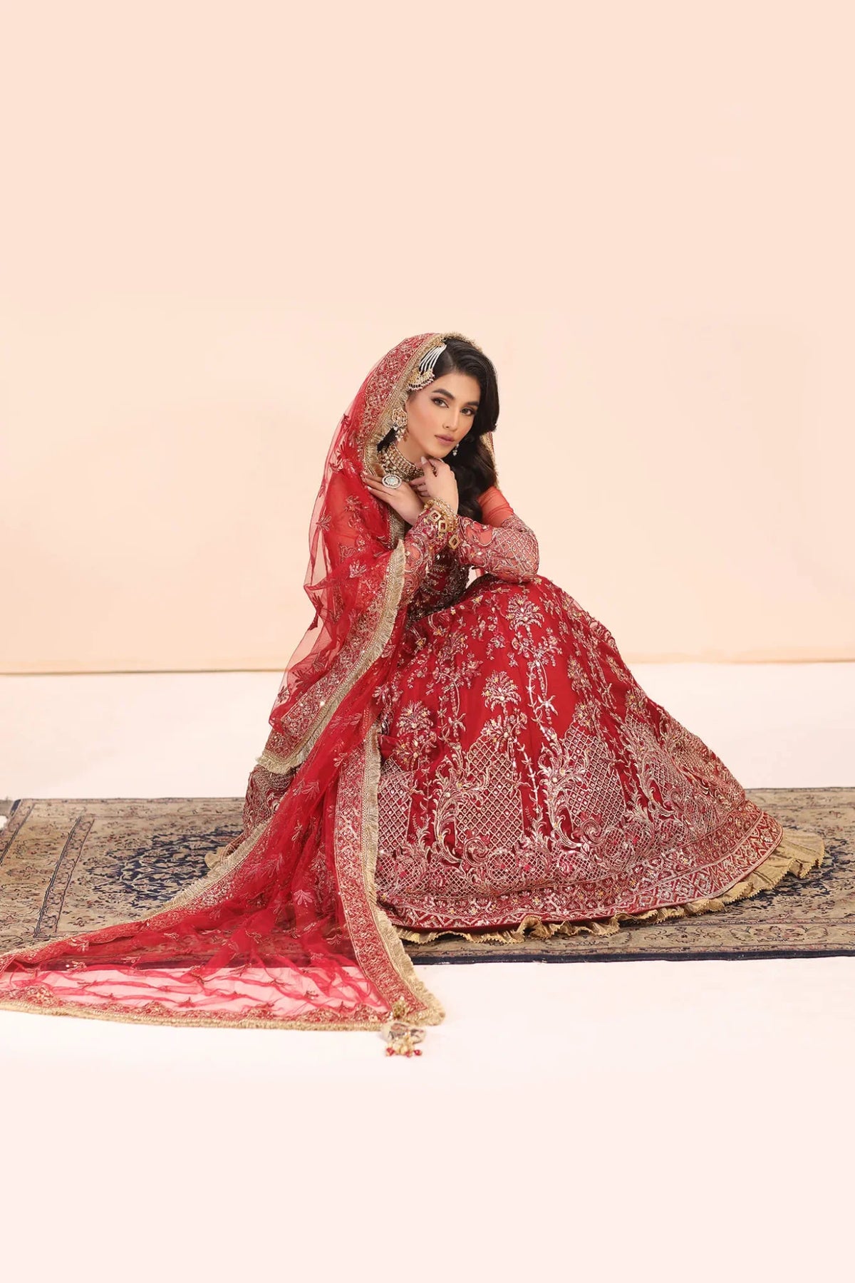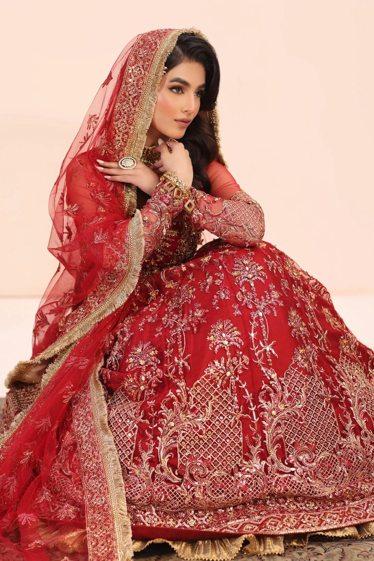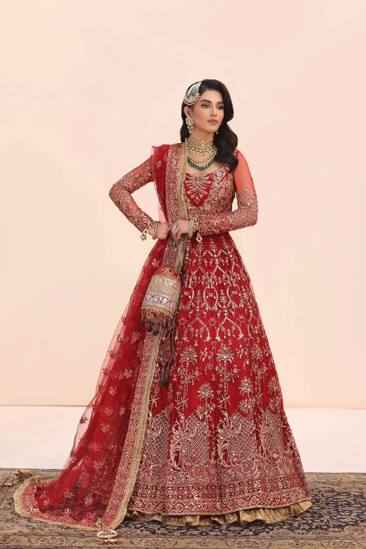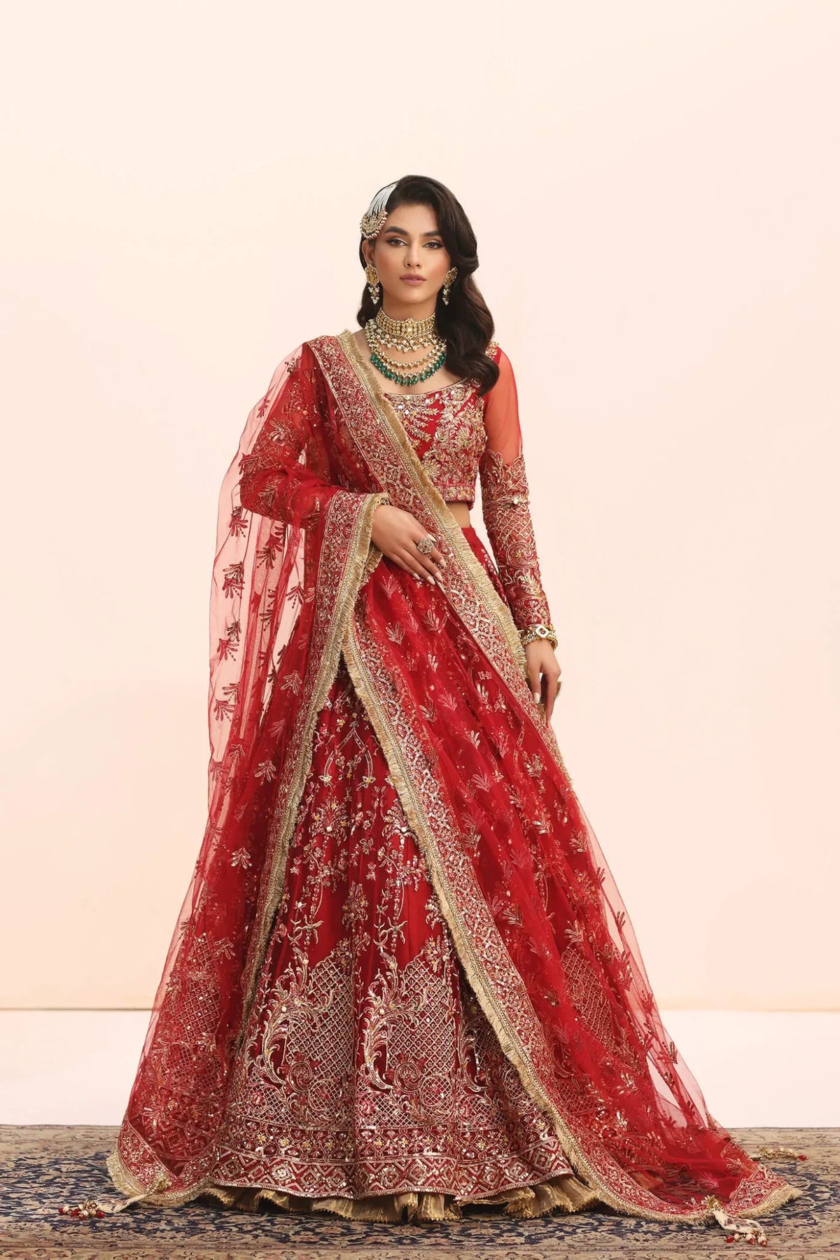 The Crimson Jewel, this masterpiece is a symphony of true artistry, with an intricately embroidered and hand embellished lehenga choli that elevates the essence of opulence. The meticulous craftsmanship unfolds as a dazzling tapestry of sequins, crystals, leaf sequins, and intricate floral details, transforming the attire into a verifiable work of art! The Crimson Jewel lehenga, adorned with an abundance of flowery sequins and expertly crafted handmade accents, exudes a regal charm that propels the ensemble to new heights of sophistication. Each sequin sparkles like a celestial star. The embroidered dupatta bursts forth with a riot of color and festivity, a radiant flourish that completes this grand design.