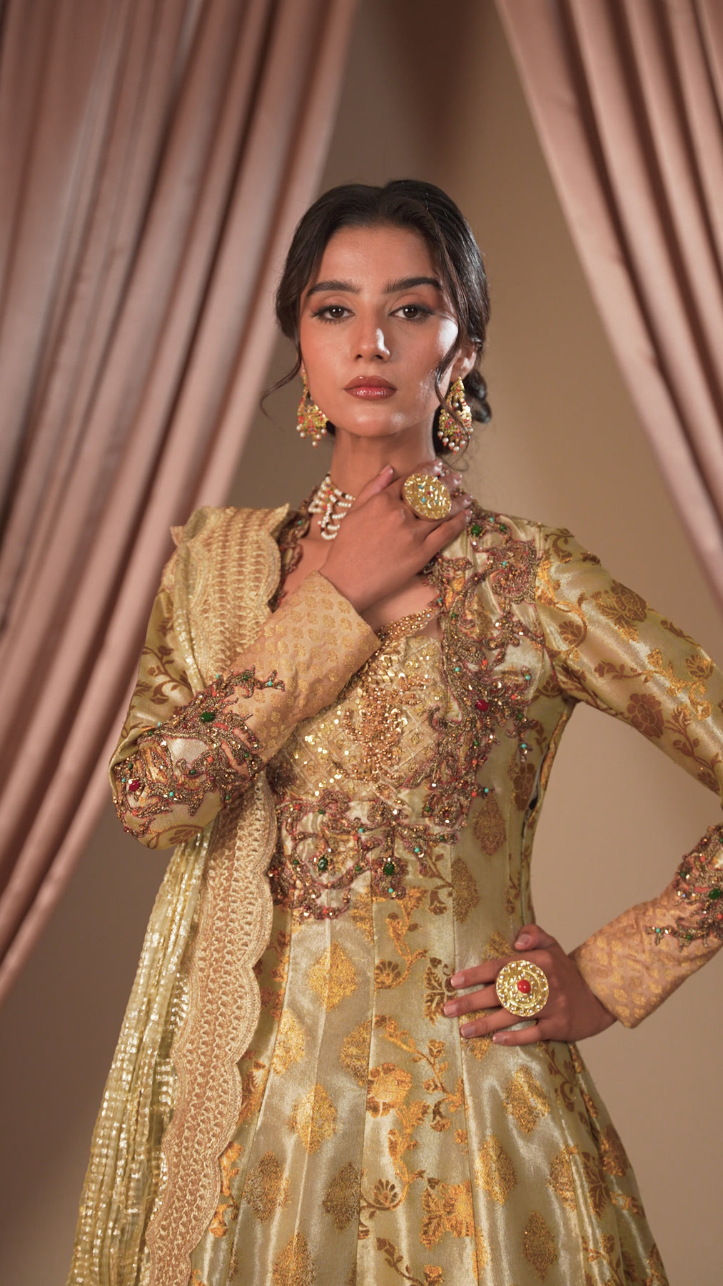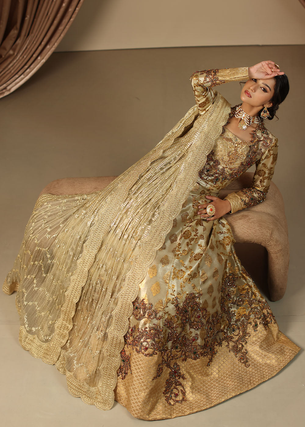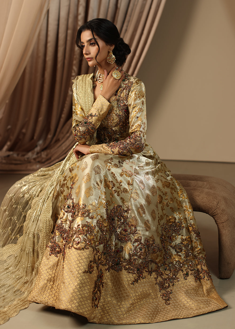 Eternal Grace is a masterpiece of timeless sophistication, radiating elegance in a stunning antique gold. This multi-paneled couture peshwas, crafted from the fusion of two exquisite types of kimkhab, exudes true grandeur.