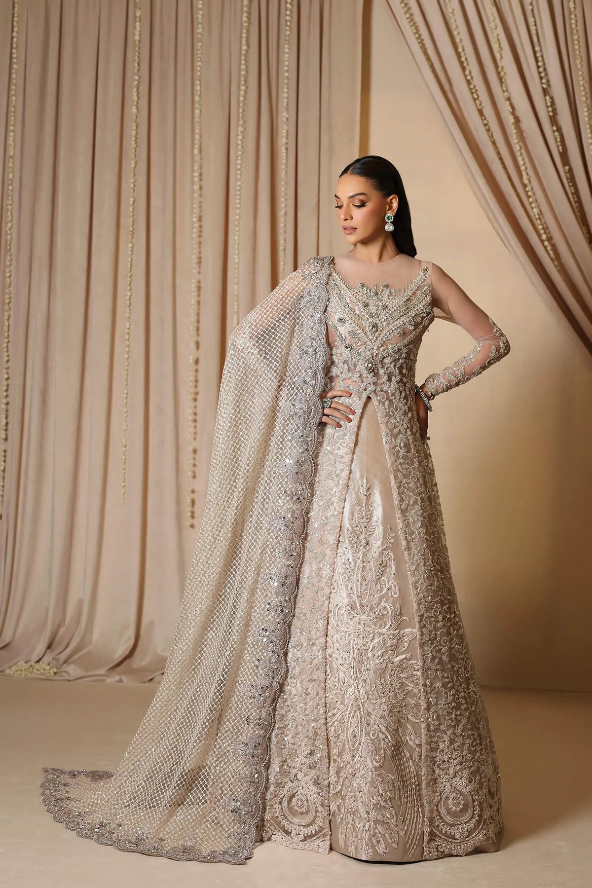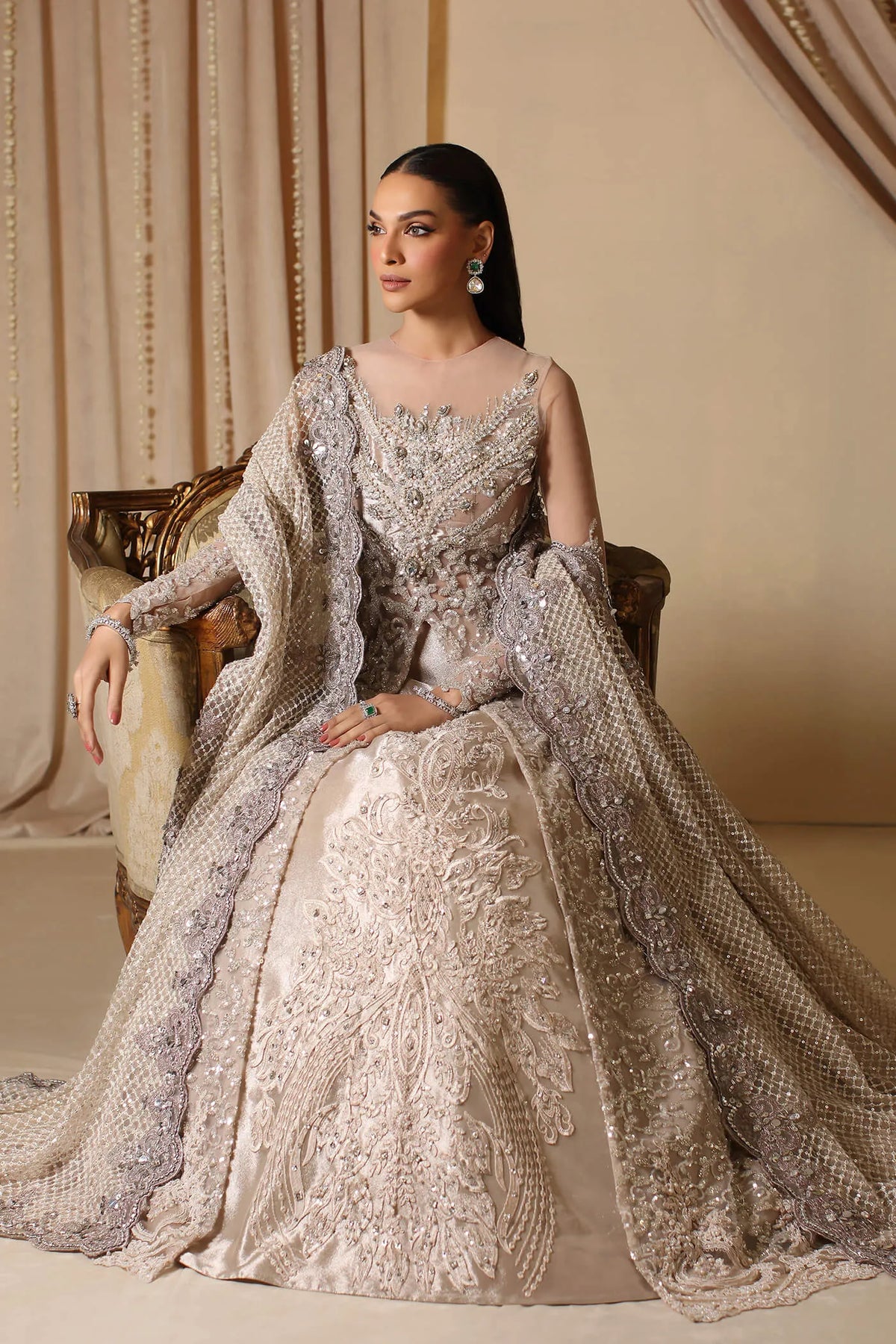 This captivating Royal Rose bridal gown, bathed in a radiant Rose Gold hue, is a marvel of craftsmanship. The gown boasts an intricate tapestry of hand-work sequins, lustrous pearls, and shimmering Swarovski crystals, each painstakingly placed to create a symphony of elegance. The meticulous nature of the handwork on royal rose, from delicate floral motifs to swirling patterns, reveals itself with refined grace through the gown’s sophisticated slit. Complementing this opulence is a sheer net dupatta, hand-finished with heavily embellished scalloped borders that cascade like a waterfall. The entire ensemble, replete with its breathtaking detailing, stands as an epitome of timeless beauty, radiating an aura of unmatched elegance and allure.